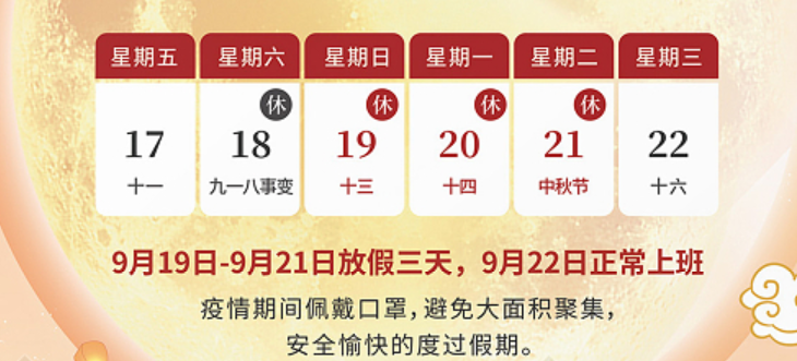 一、2021年9月19日(星期日)至9月21日(星期二)中秋放假調休,共3天。2021年9月22日(星期三)正式上班。
